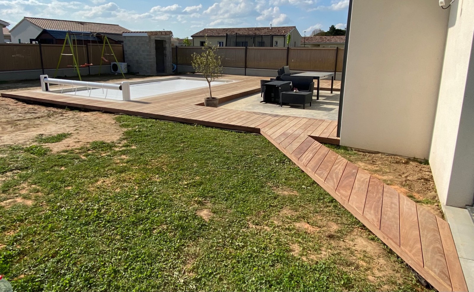 Terrasse en cumaru autour d’une piscine – Vue d’ensemble à proximité de Libourne (33)