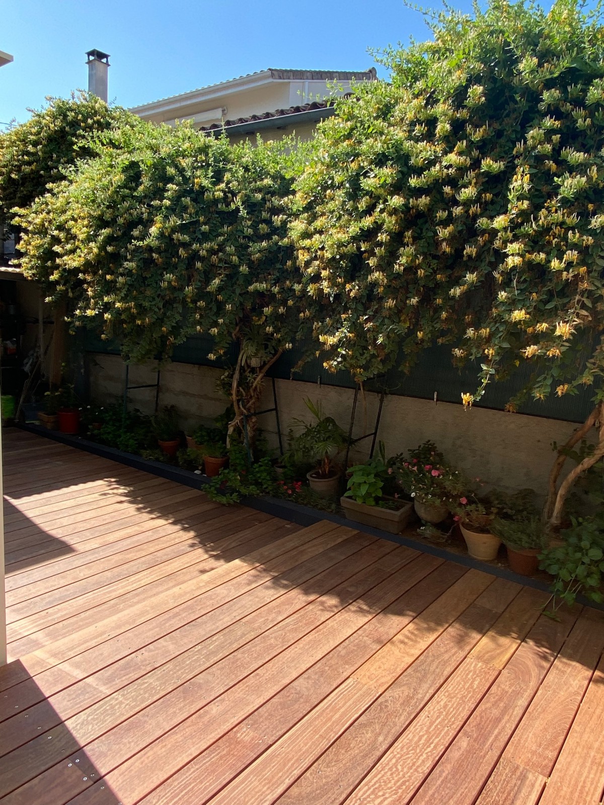 remplacement d'une terrasse en pin par une terrasse en composite couleur teck de 100m² avec jardinières a saint André de Cubzac près de bordeaux