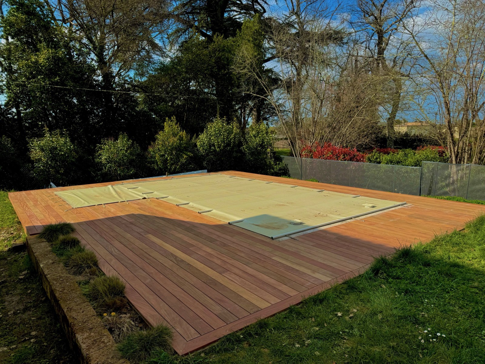 Terrasse en cumaru autour d’une piscine – Vue d’ensemble à proximité de Libourne (33)